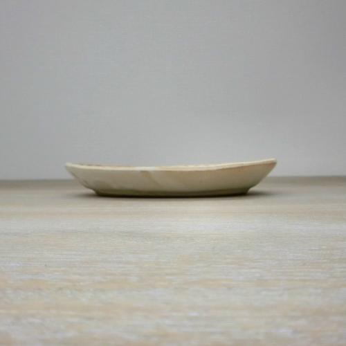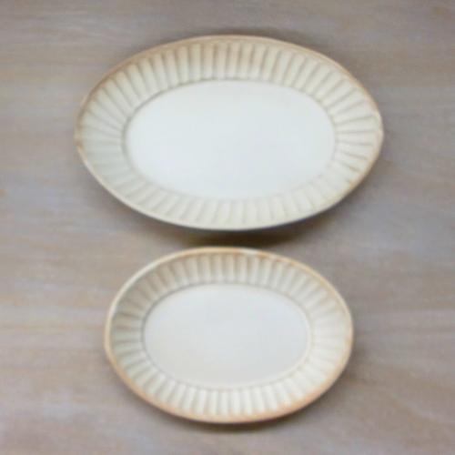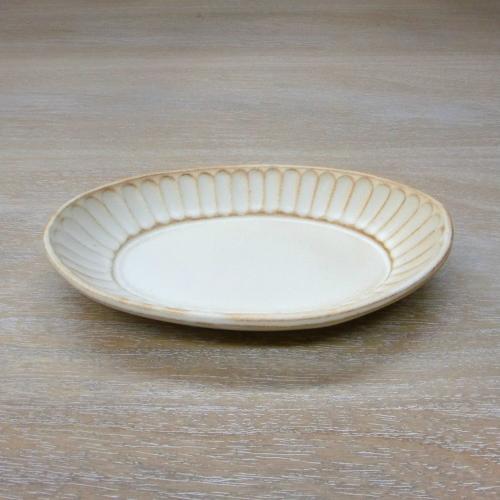 益子焼窯元わかさま陶芸のkinariシリーズ。マットな質感の粉引の器で、土の素朴さを感じるような手触りが心地よい、ナチュラルで優しい雰囲気のシリーズです。 ※汚れ止め加工がされていますのでつや消し釉薬ですが汚れにくくなっています。 しのぎの模様が内側に施された楕円皿。取り皿サイズ。深さがあるので汁ものにも使えます。だ円なので複数のおかずをとりわけるのにも便利です。カレーやパスタに便利な中サイズもあります。