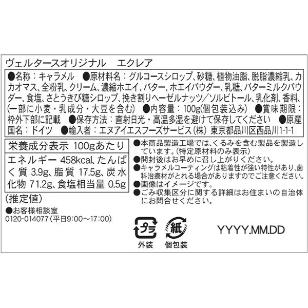 | 備考 | ヴェルタースオリジナルは、ドイツ生まれのキャラメルブランドで、1903年の創業以来、高品質なキャンディ、チョコレート菓子を開発、製造してきました。 伝統を守りつつ、ドイツにある3つの工場で生産しており、世界100カ国以上でユニークなブランドや商品を展開しています。濃厚でなめらかな味わいが特徴で、老若男女問わず幅広い世代に親しまれています。 |