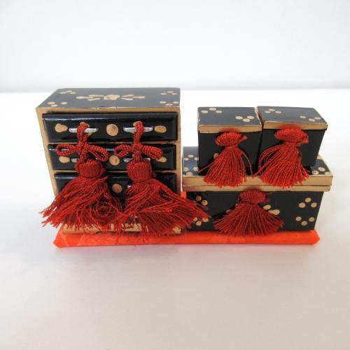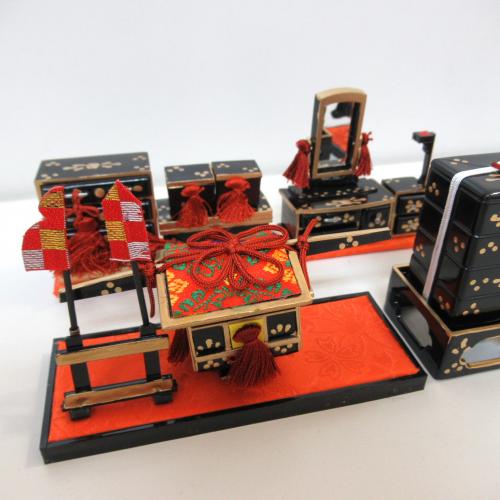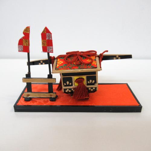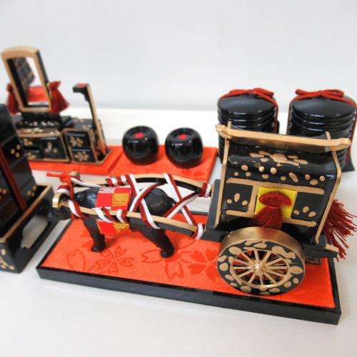 御所車、おかご、重箱、三つ揃、鏡台針箱、火鉢、貝桶の七品です。