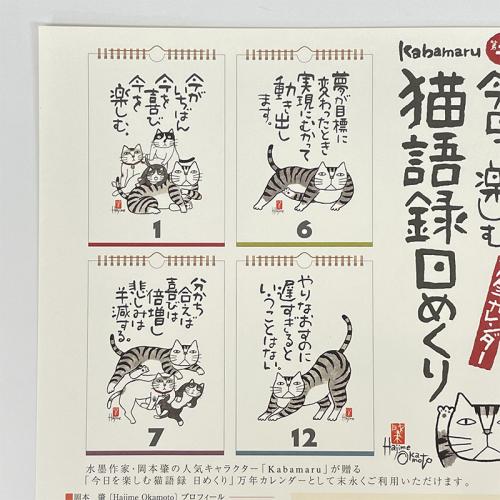 水墨画作家/岡本肇の人気キャラクター「Kabamaru」が贈る「今日を楽しむ猫語録 日めくり」万年カレンダーとして末永くご利用いただけます。
