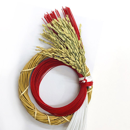 4580325472523丁寧に美しく編み込んだ竹の輪に贅沢にたっぷりと稲穂が束ねられられています。垂らした白の水引がアクセント。 竹は邪気を払い、稲穂は五穀豊穣という願いが込められた縁起の良い組み合わせのお正月飾りです。