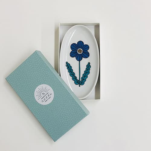 ふわっとした色使いでかわいい青いお花が描かれている楕円型の小皿です。手のひらにおさまるかわいいサイズ。どんなシーンにもお使いいただけます。