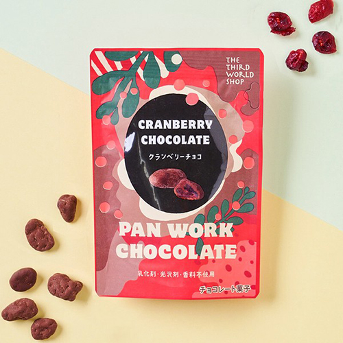 オーガニックのクーベルチュールチョコレートでドライクランベリーをコーティングした、おやつにぴったりのフェアトレードチョコ菓子「パンワークチョコレート」。