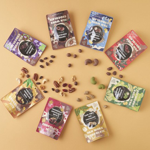 パンワークチョコレートとは、回転している釜の中でドライフルーツやナッツなどを芯として、チョコレートをコーティングしたお菓子のことです。