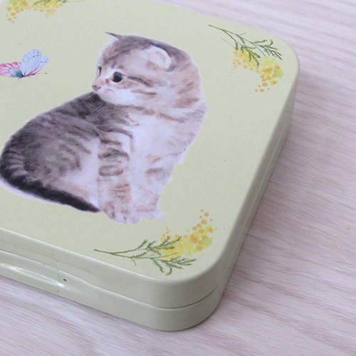 水彩タッチなイラストの子猫をミニ缶にしました。 7cmくらいのフラットなスクエア缶です。 ストロベリー風味キャンディ4個入りです。 猫好きの方へのギフトにもピッタリのお品です。 内容量:9g