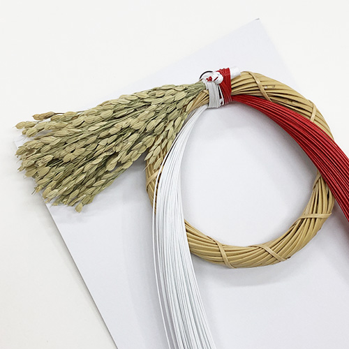 年が明けたことを「ことほぐ」というそうです。過ぎた年に対する感謝と、来たる年に対する気持ちが込められているとされます。 赤/魔除け、白/清浄を意味する水引をあしらったお正月のリースです。 ※台紙をつけた状態で撮影しています。