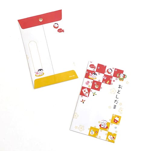 小さく細やかなお正月の縁起物が散りばめられた、落ち着いたデザインのお年玉袋です。