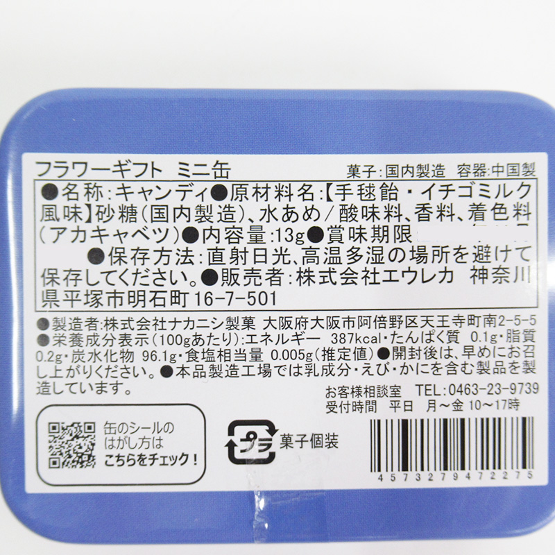 | 素材 | 原材料名:【手毬飴・イチゴミルク風味】砂糖(国内製造)、水あめ、イソマルトオリゴ糖/酸味料、香料、着色料(アカキャベツ) |