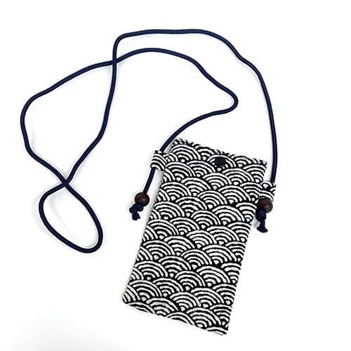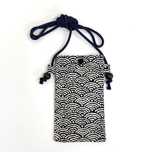 無限に広がる波の文様には未来永劫へと続く幸せへの願い。人々の平安な暮らしへの願いが込められた縁起の良い柄の青海波。長めのロープ紐がついているので斜めかけにもできます。開け口にはスナップボタンがついていて安心です。スマホやちょっとしたものを持ち歩きたいときに便利な小物入れです。