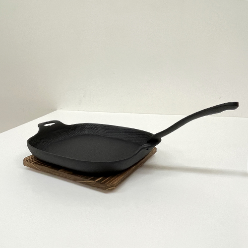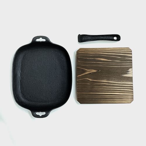 大きめの食材を焼くのにぴったりなサイズです。鉄器の蓄熱性で食材を返さずに焼くことが可能で、グリルの出し入れは専用の着脱式ハンドルでスムーズです。出来上がったお料理はそのまま木台にのせテーブルへ運べて、お魚、野菜、焼きおにぎりも美味しく焼けます。