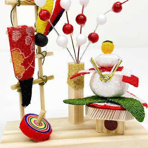 鏡餅や羽子板のお正月飾り。細工には、深く刻まれたうずらちりめんが使われています。職人がこだわりを持って仕上げた”京の手仕事”のお正月飾りです。