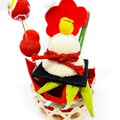 鏡餅と梅のお正月飾り。細工には、深く刻まれたうずらちりめんが使われています。職人がこだわりを持って仕上げた”京の手仕事”のお正月飾りです。