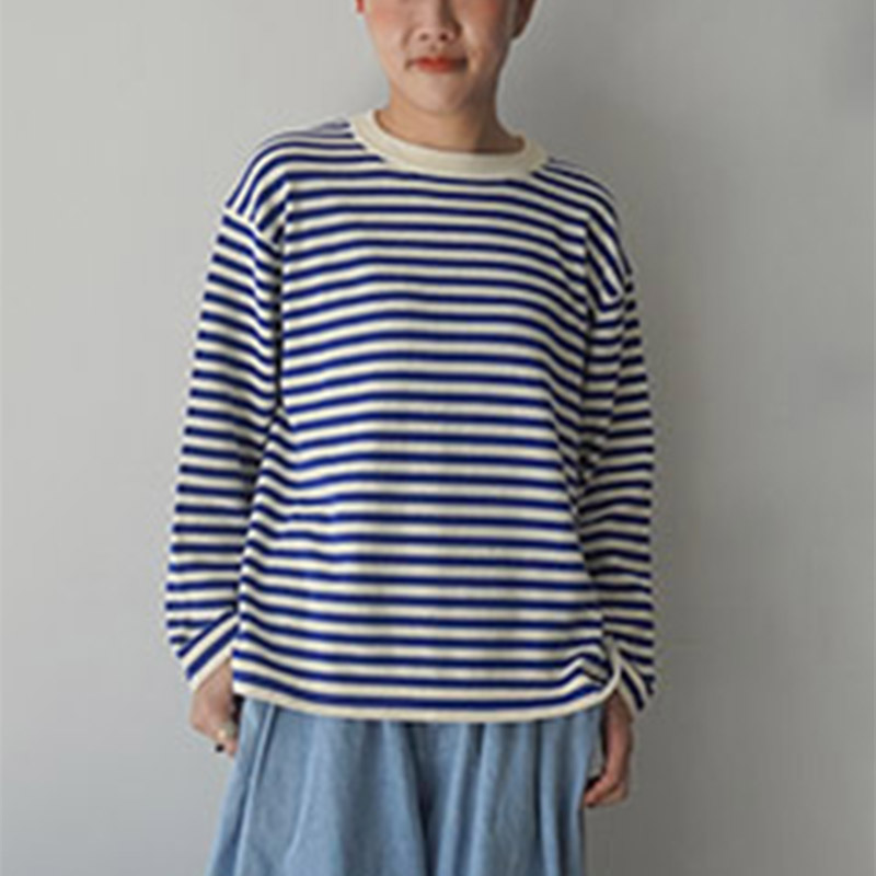 やわらかな風合いのソフトコットンの糸を使用した薄すぎず厚すぎず、春の始まりには使い勝手がちょうど良い肉感の編地で仕上げた、しましま&みずたまパターンミックスプルオーバーです。