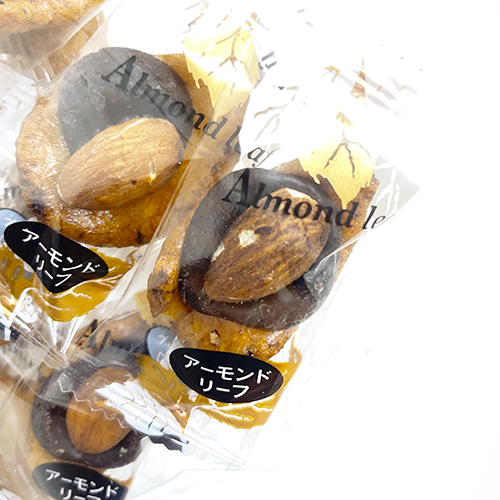かわいい木の葉のおかきに、チョコレートとアーモンドをのせました。 【第26回全国お菓子大会博覧会 2013農林水産大臣賞受賞】