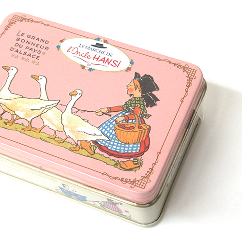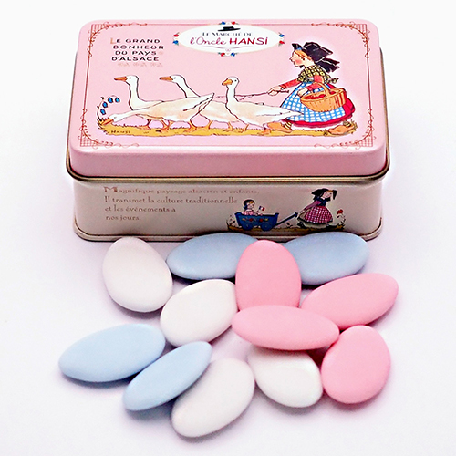 フランス、アルザス地方の伝統菓子 アルザスの伝説的アーティスト、アンシおじさんの イラストと共にお送りいたします♪ かわいく懐かしいイラストのデザイン缶の中に、表面を薄い砂糖でコーティングされた甘さ控えめのチョコレートが入っています。 可愛らしい缶には、19世紀から20世紀初頭に活躍したアルザス出身の水彩画家、アンシおじさん(本名:Jean Jacques Waltz(ジャン=ジャック・ヴァルツ)のイラストが描かれています。 自分用に、ちょっとしたプレゼントにも最適です。 内容量:約70g