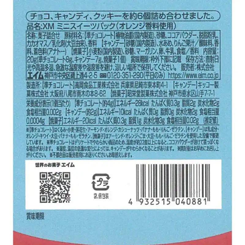 かわいいクリスマスデザインのパッケージに、キャンディ、クッキー、チョコを約6個詰め合わせました。 ラッピングの手間なくそのまま配れるミニサイズのアソートです。 内容量:20?