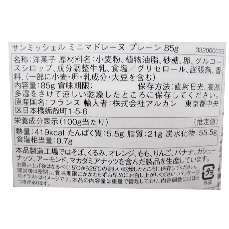 | 備考 | 【サンミッシェル社】 創立1905年の100年を超える歴史を持つ企業。菓子職人ジョセフ・グルリエが作る「ガレット」「マドレーヌ」は、新鮮で安全なフランス産の原料を使った伝統のレシピを守り続け、フランスで長く愛されているお菓子になりました。 |