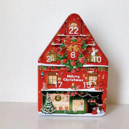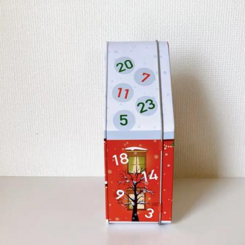 家の形をした缶のアドベントカレンダーです。木製オーナメント付(サンタのみ磁石つき)
