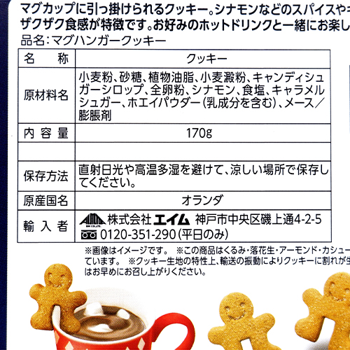 | 備考 | 原材料名:小麦粉、砂糖、植物油脂、小麦澱粉、キャンディシュガーシロップ、全卵粉、シナモン、食塩、キャラメルシュガー、ホエイパウダー(乳成分を含む)、メース/膨脹剤 ※この商品はくるみ・落花生・アーモンド・カシューナッツ・大豆を使用した設備で製造しています。 |