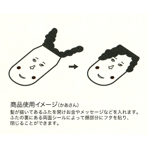 KAMI-POCHI Gift Envelope 「かみぽち かあさん」です。 袋には顔、フタには髪が描かれているぽち袋です。 顔と髪の組み合わせよって様々な表情を楽しめ、贈る人も贈られる人も楽しい気持ちにしてくれます。 使い方:髪が描いてあるふたを開けお金やメッセージなどを入れます。 ふたの裏にある両面シールによって顔部分にフタを貼り、閉じることができます。 2枚セット
