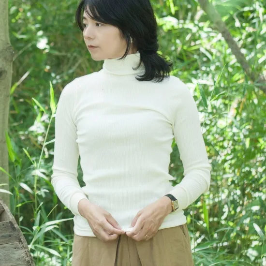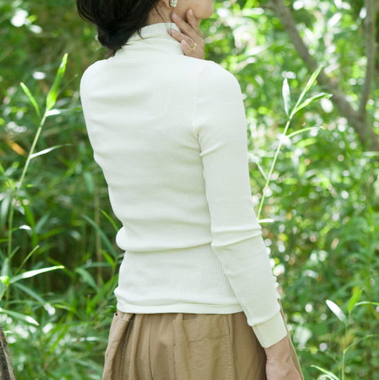 首もとに、しなやかに寄り添うリブタートルネック ボディラインをきれいに見せてくれるリブ素材。 横方向への伸縮性に富んでいるのでからだの動きや体型にやさしくフィットし着心地が良いのが特徴です。 一枚で着るのはもちろん、もたつかないので、重ね着のインナーとしても 活躍してくれます。 オーガニックコットン100%なのでウールのニットなどのチクチクが気になる方でも安心です。 シンプルで大人っぽく見せてくれるので秋冬に一枚は持っておきたいアイテムです。