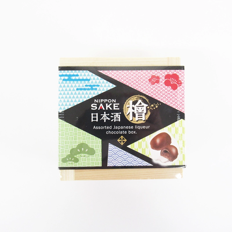 一合サイズ(約180ml)の檜枡に異なる6蔵元の地酒入りボンボンチョコを6個アソートしました。