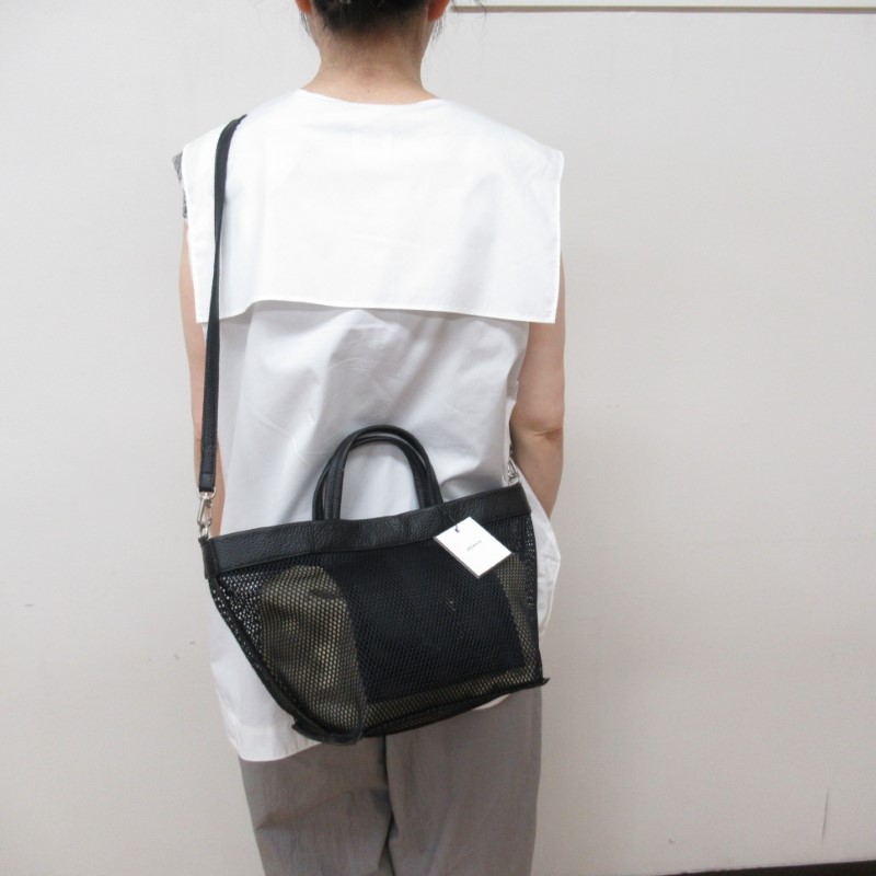 コーティングでハリを出したナイロンメッシュとレザーのコンビのミニトートバッグ。