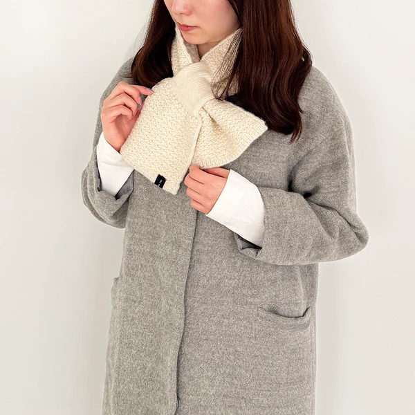 巻いたり結んだりする手間がなく、片方の端をループに通すだけで簡単に着用可能なニットマフラーです。