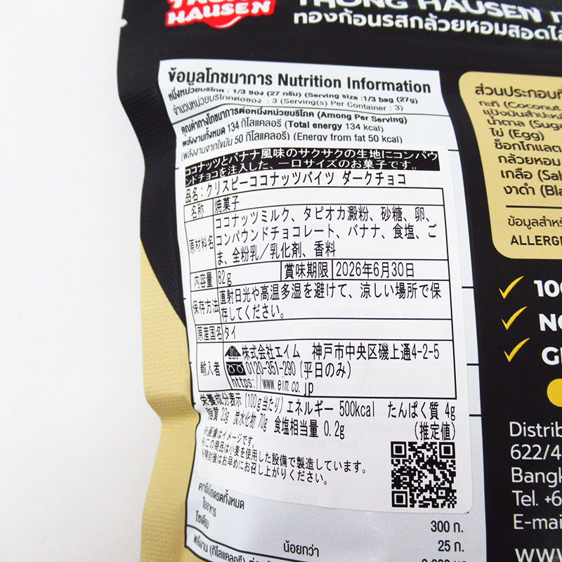 バナナフレーバーのココナッツロールの中に、ダークチョコレートが詰まった一口サイズのサクサクのスナックです。香ばしいココナッツの風味とチョコレートの豊かな味わいが広がります。ティータイムやちょっとしたギフトにもおすすめです。