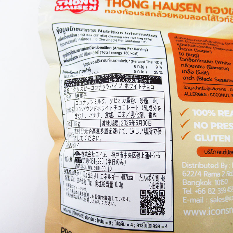 バナナフレーバーのココナッツロールの中に、ホワイトチョコレートが詰まった一口サイズのサクサクのスナックです。香ばしいココナッツの風味とチョコレートの豊かな味わいが広がります。ティータイムやちょっとしたギフトにもおすすめです。