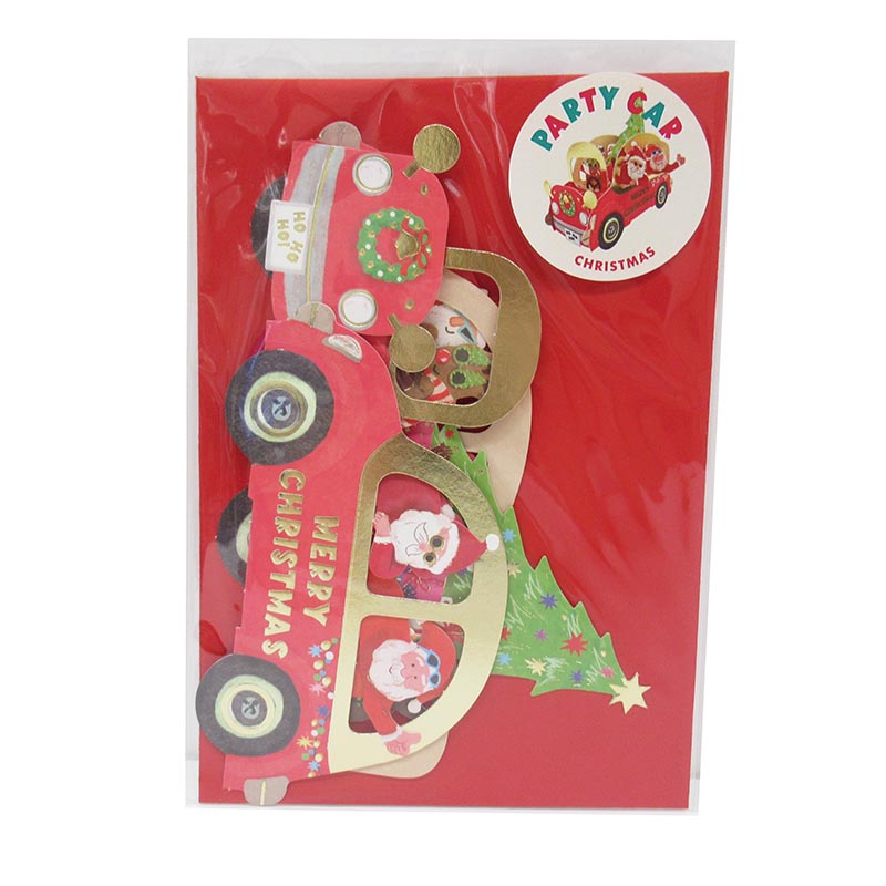 陽気なサンタと動物たちが車に乗ってパーティーしているポップアップカードです。