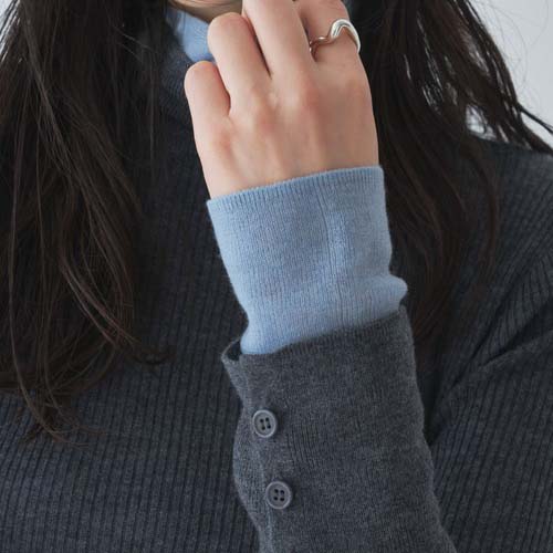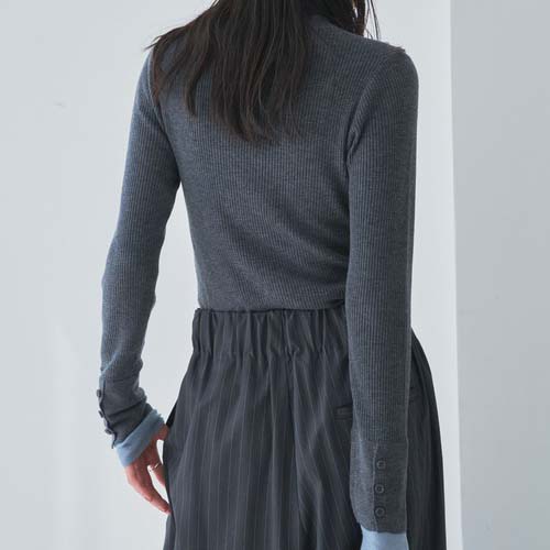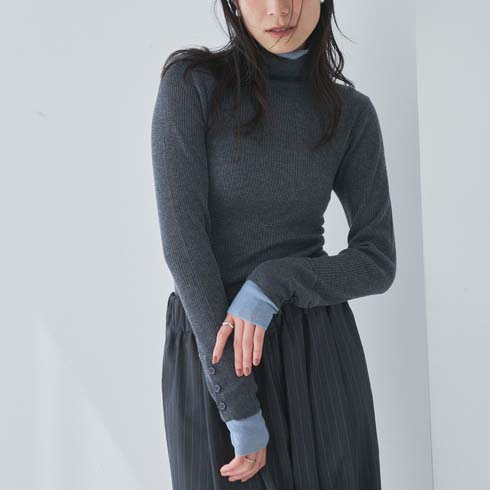 袖口にあしらった3つの小さなボタンがアクセントになり、釦を開けてスリットデザインとして着用すると、内側にレイヤードしている配色部分がちらっと見えてお洒落な印象に。