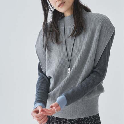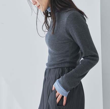 ウール混特有のチクチク感がない肌触りで、ハイゲージならではのなめらかな肌当たりが心地よい素材です。