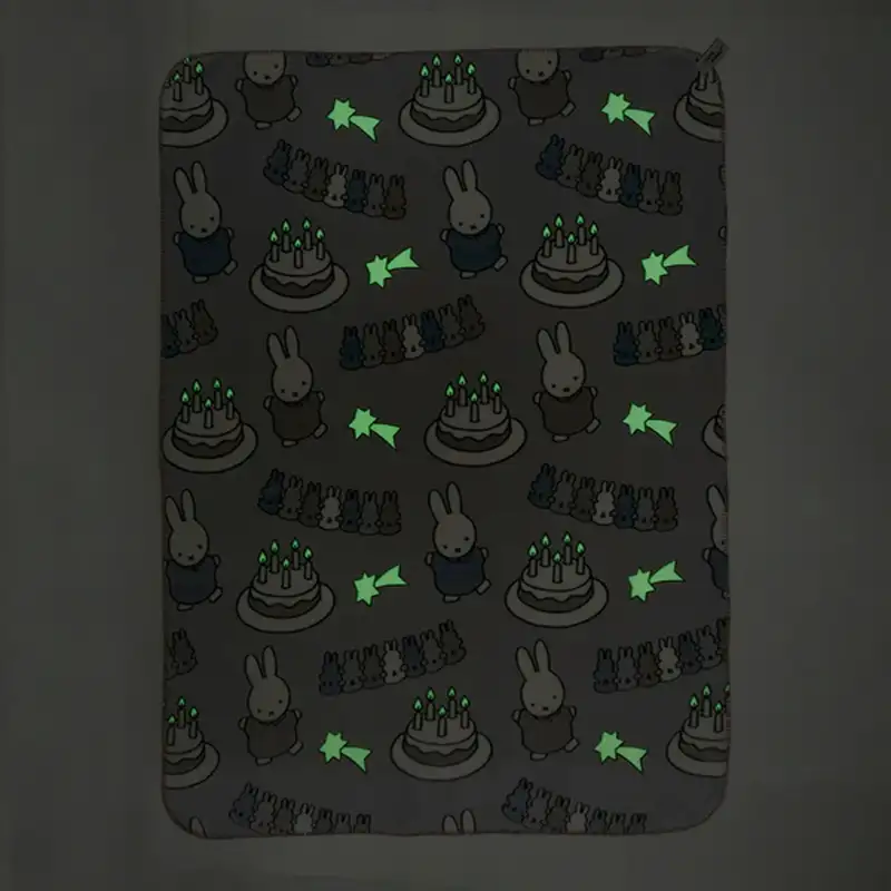 蓄光プリントによって暗闇で柄の一部が光りだす遊び心満載のブランケット。