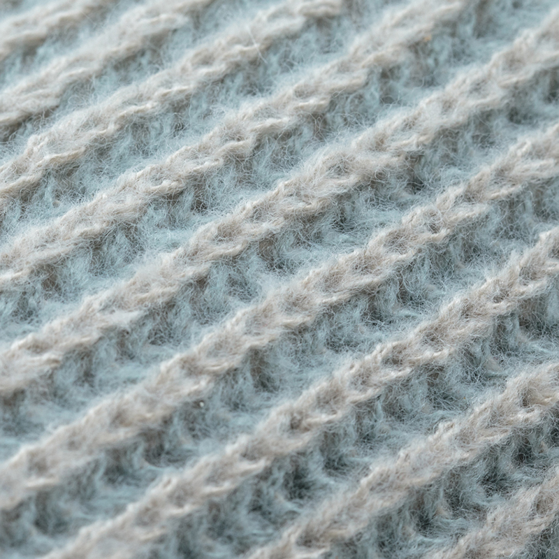 甲のニットは表目と裏目で色を変える技法のシャドウ編み(Shadow Knitting)を採用。配色により色の深みが感じられます。