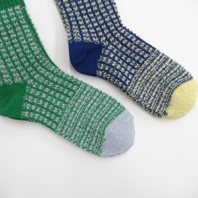 ふわふわとしたリングヤーンとコットンを使用し、3パターンの柄を組み合わせてざっくりと編んだ靴下です。
