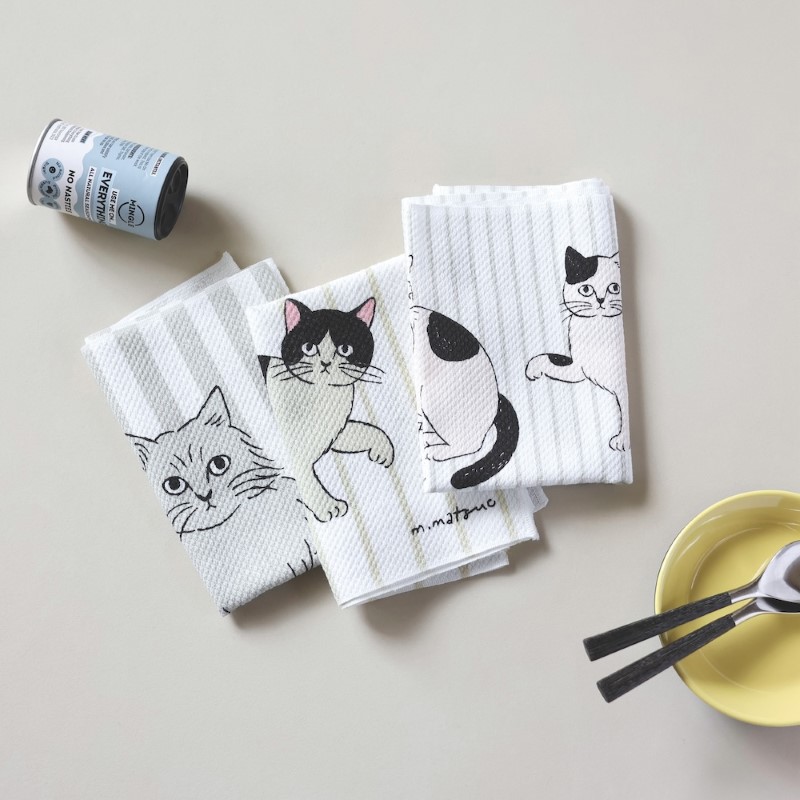 ストライプ柄を背景に、松尾ミユキさんのネコたちがちょこんと描かれたキッチンクロス。
