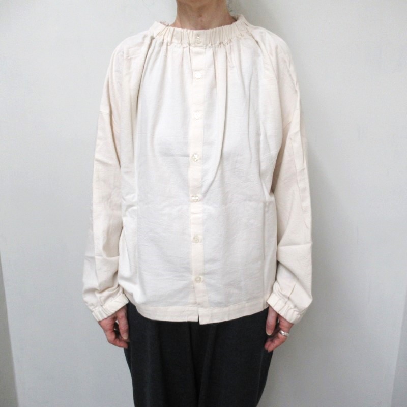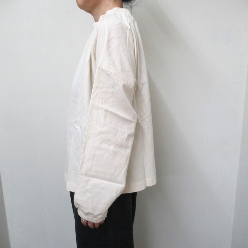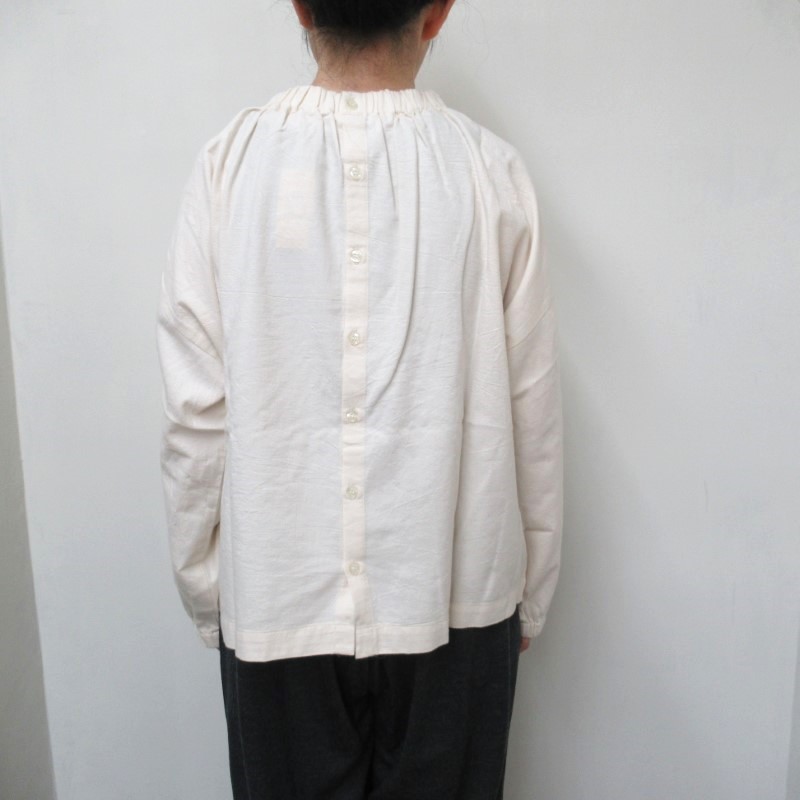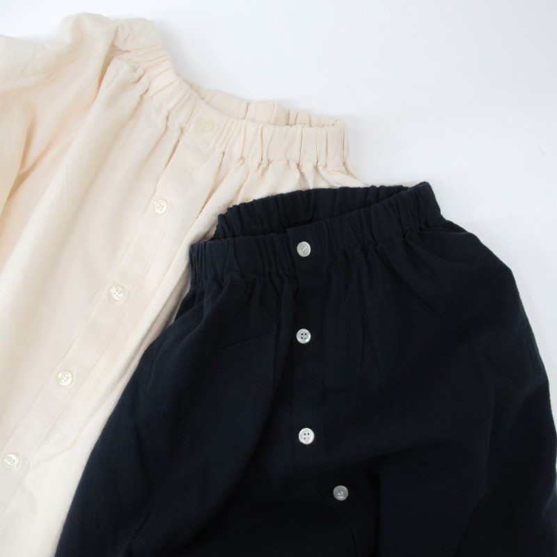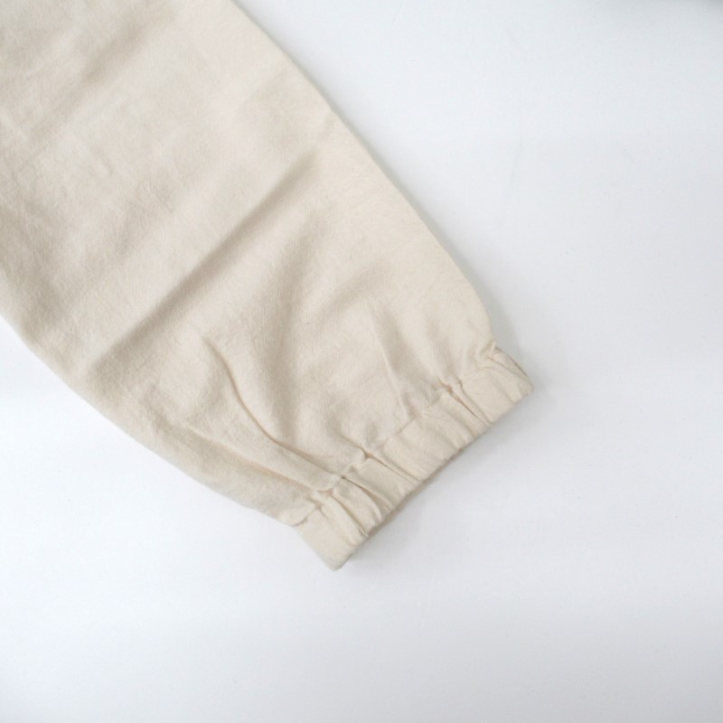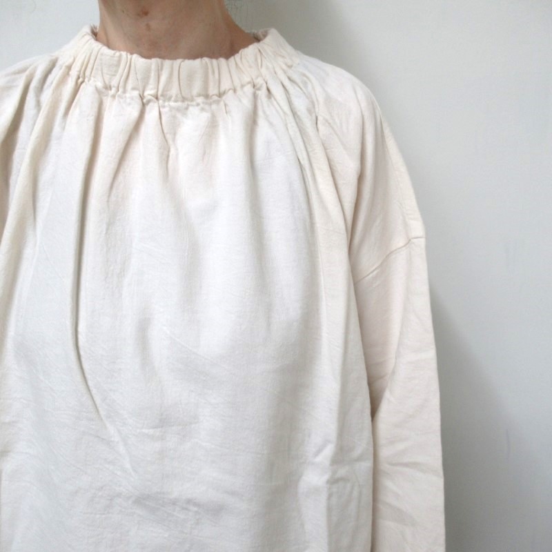 衿と袖口にはゴムが入り、スモック風のナチュラルな雰囲気の1枚です。