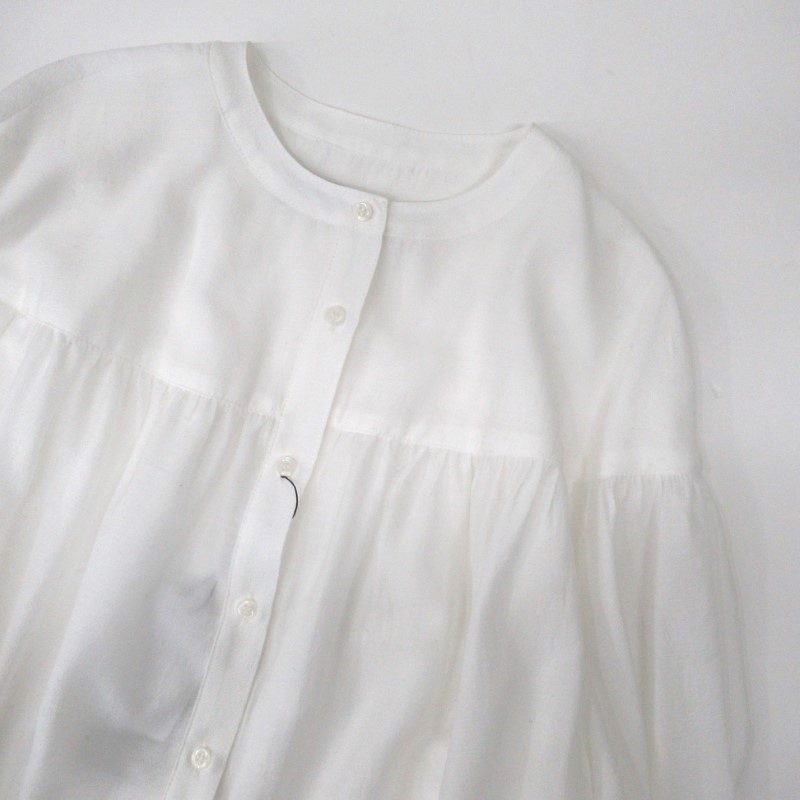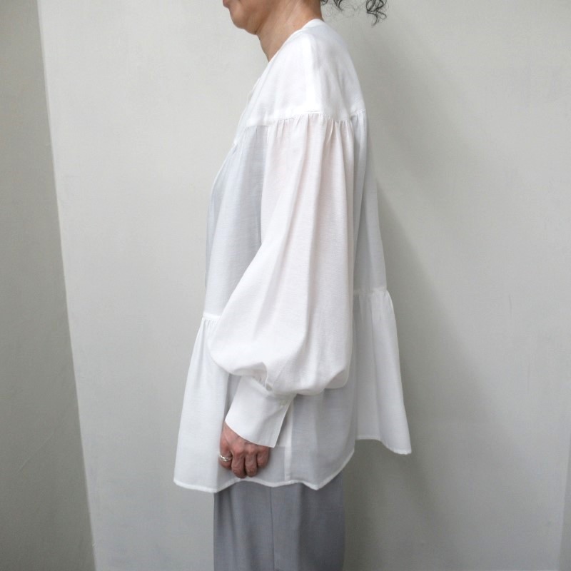 ボリュームスリーブと表情のある生地感が上品さを出しています。 バンドカラーで甘さを抑え、ほんのりとしたシアー感が大人の雰囲気です。