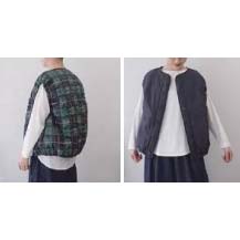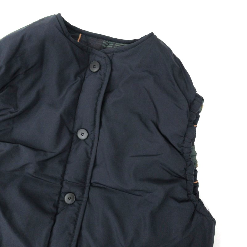 インクジェットプリントを施したやわらかなタフタを中綿キルトにしたモノと、無地の配色タフタでリバーシブルに仕立てたコロンとしたフォルムのリバーシブルベストです。
