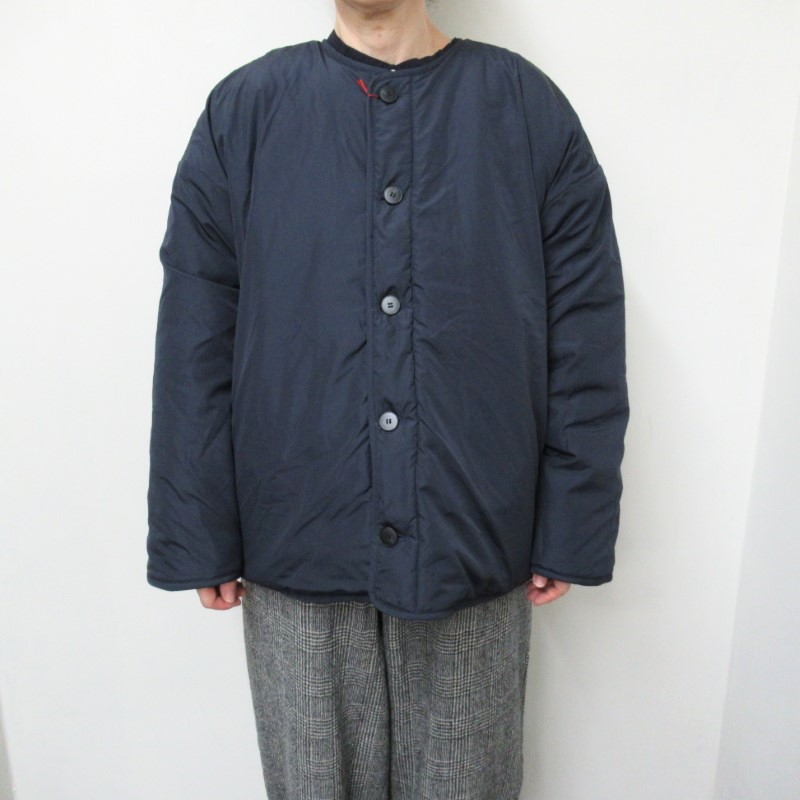 インクジェットプリントを施したやわらかなタフタを中綿キルトにしたモノと、無地の配色タフタでリバーシブルに仕立てたリラックスした着心地のリバーシブルジャケットです。