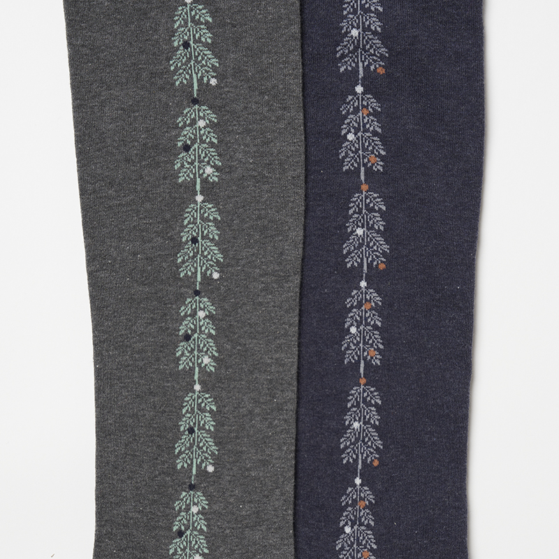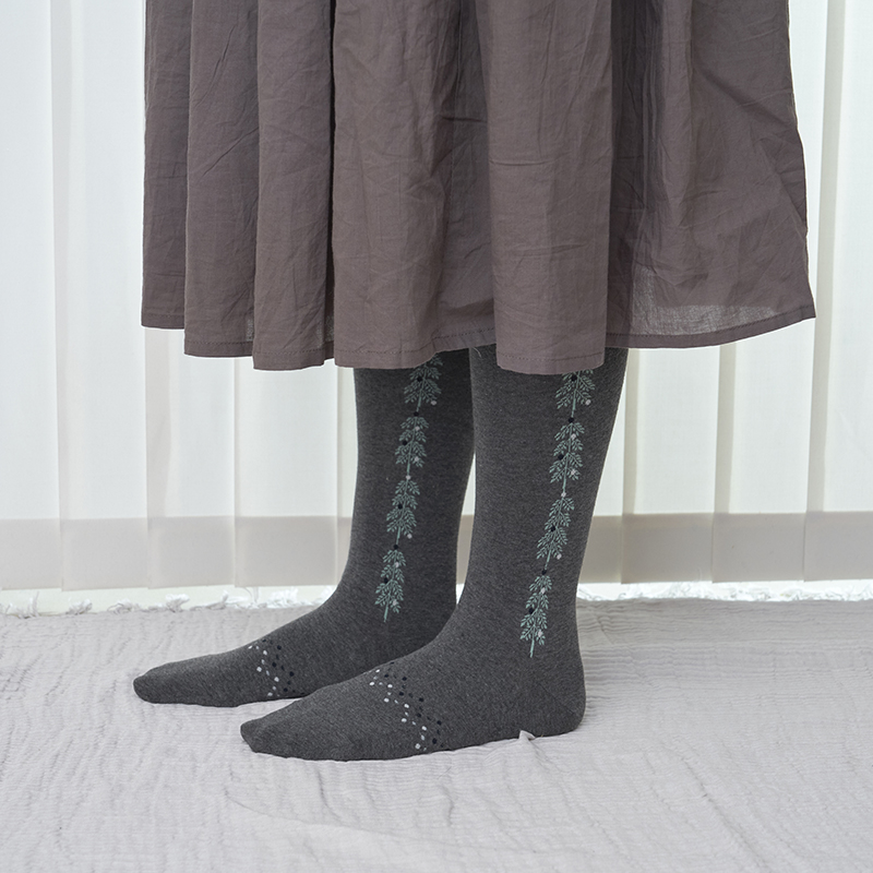 両サイドに森のデザインをあしらった可愛いタイツです。 甲をぐるりとあしらったドット柄は靴を脱ぎ履きする際や、友人宅、また小上がり席の食事会など靴を脱ぐシーンに履きたい1足です。