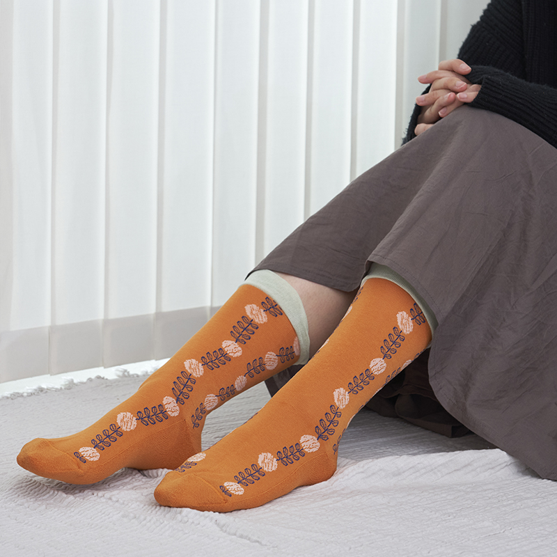マリーゴールドが左右に並んだ可憐なデザインです。 つま先から ふくらはぎまで連なるスケッチ風の花柄は、脚を細く見せてくれる効果もあります。
