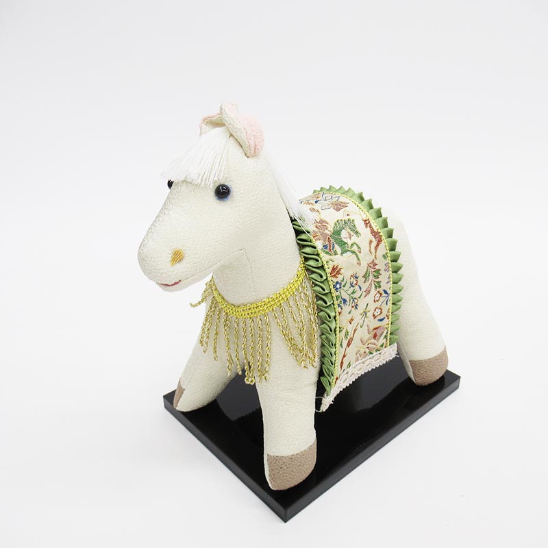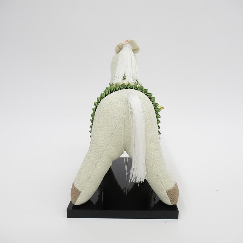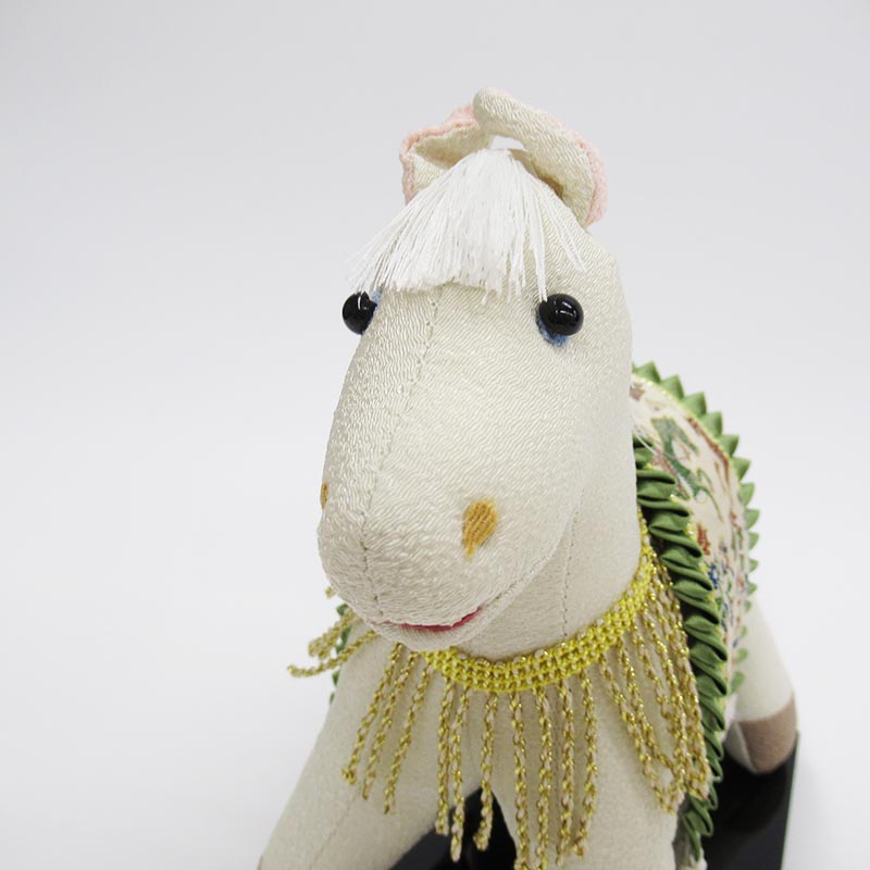 2026年の干支、午のお正月飾りです。背中の鞍飾りは、1843年創業の京都の川島織物の裂地を使用。ペルシャ染織品の黄金時代といわれる十六世紀の裂地から取材したもので、草原に遊ぶ貴族たちの姿が巧みに表現されています。