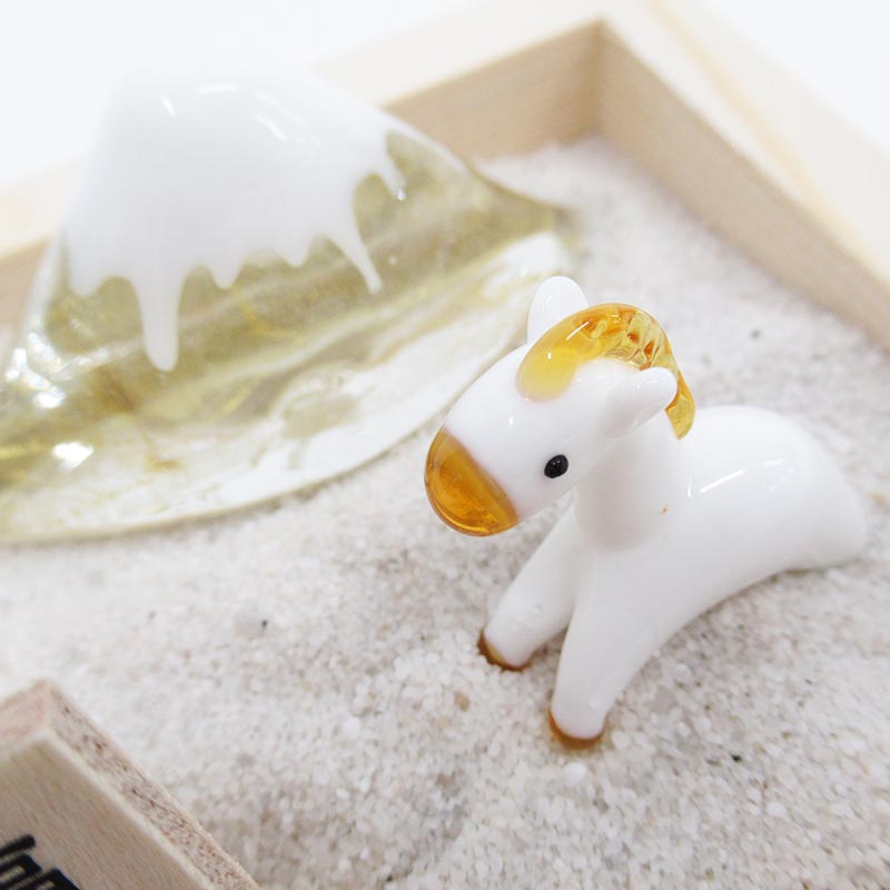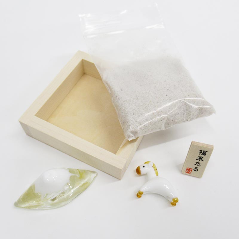 桝に白砂を敷いて、ガラス細工の縁起物を自由にレイアウトできる、手のひらサイズのインテリアです。