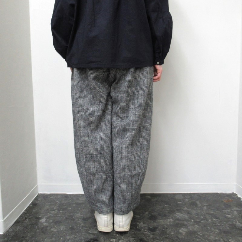 グレンチェックのウール100%テーパードシルエットパンツ。