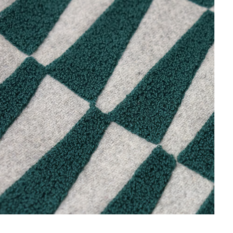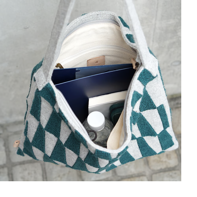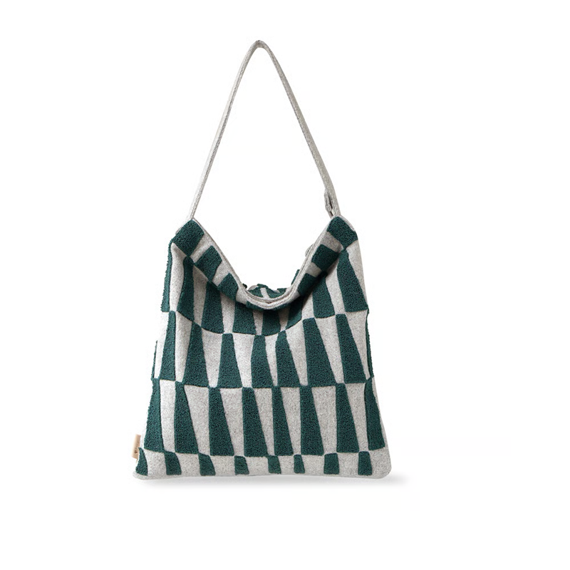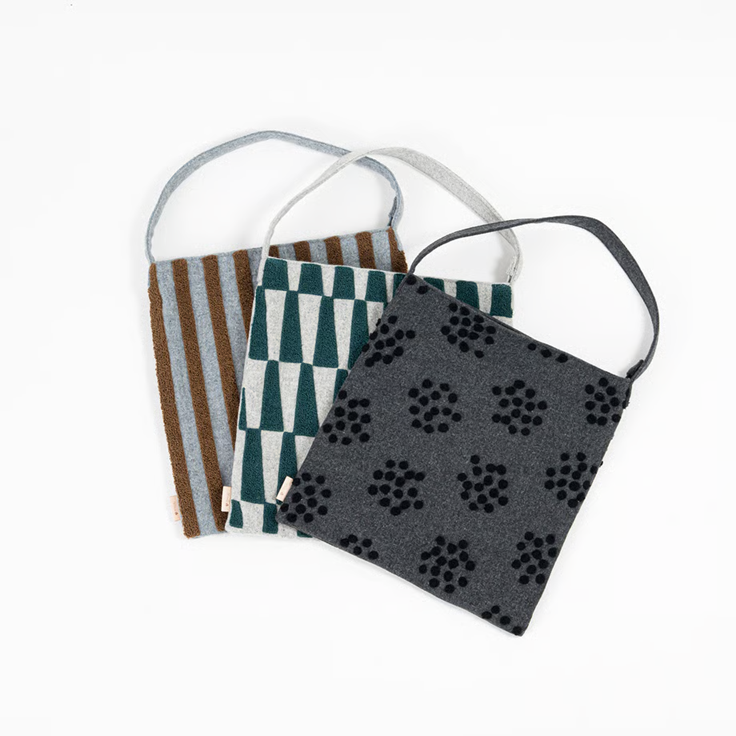 本体はウール混の生地を使用。多色の糸で織られており、奥行きのある表情の生地にサガラ刺繍を施すことによってニュアンスを持たせたバッグです。