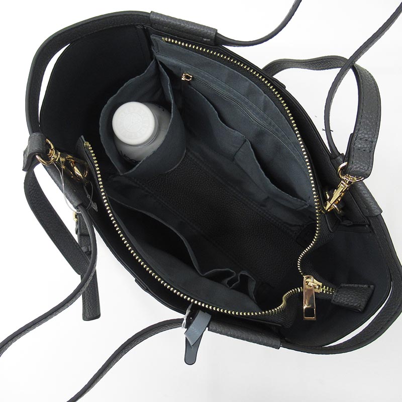 仕切り構造になっており、オープンポケットと、ファスナーポケット+仕切りポケット、ボトルホルダーやペンポケットまで付いた多機能仕様。