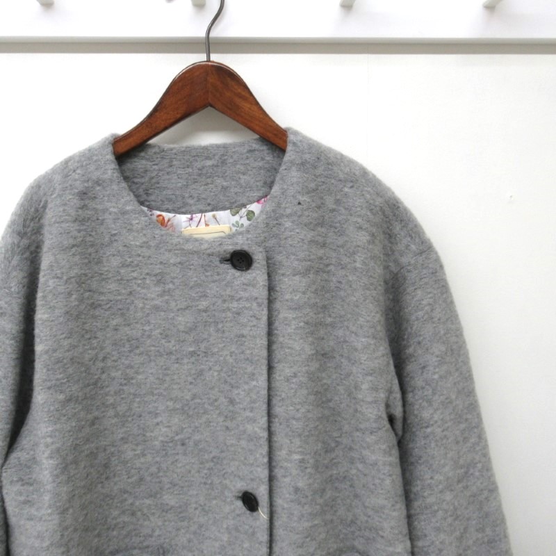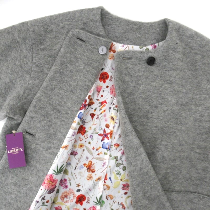 裏地にリバティ生地を使い、脱いだ時もすっきりとしたノーカラーからチラリと華やかな柄が見えます。