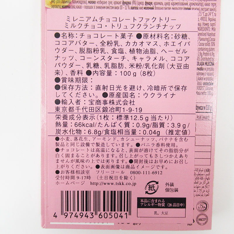備考 | 1999年に設立されたミレニアムチョコレートファクトリー社は、ウクライナでトップ3のチョコレートメーカーとして最高品質の製品により2020年から22年までベストチョコレート部門で1位を獲得。最先端の製造設備によりコーシャおよびハラール認証を取得し、現在はEU諸国、USA、アジア、アフリカ等世界35か国以上に輸出しています。 |